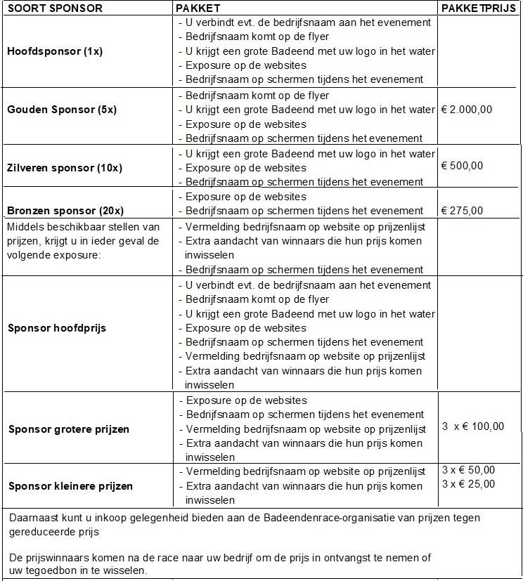 De Badeendenrace Sneek is een vrolijk en uniek gezinsevenement dat niet mogelijk zou zijn zonder de steun van betrokken sponsoren. Dankzij ondernemers, winkels en organisaties die in 2023 gul bijdroegen met geld of prijzen, werd het een daverend succes. Daarvoor onze hartelijke dank! In 2025 gaan we er samen weer een feest van maken — en uw bijdrage maakt het verschil!